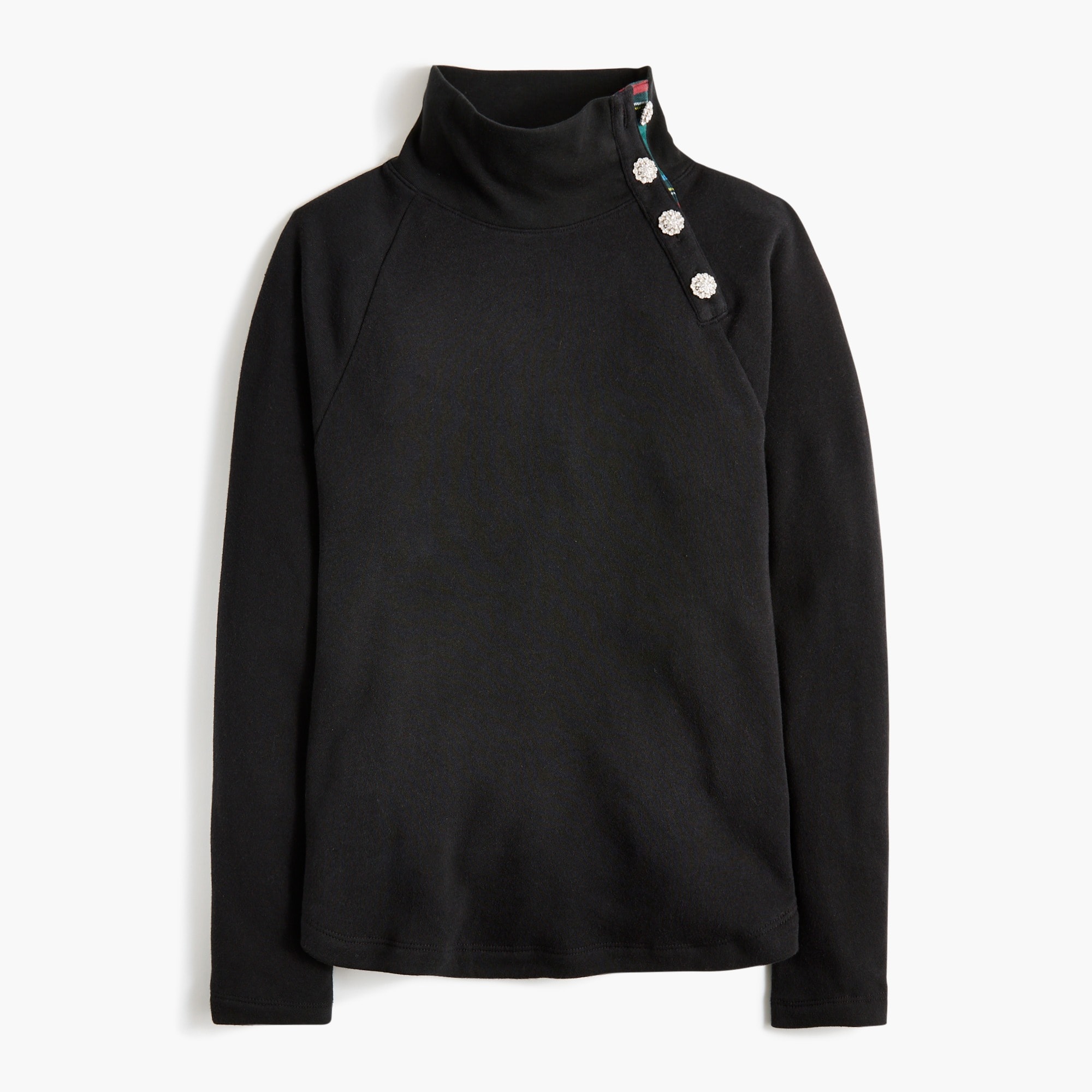Tartan wide jeweled button-neck pullover sweatshirt